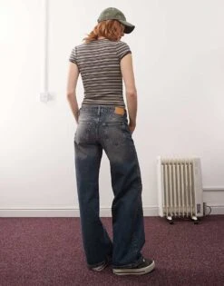 Monki Imoo Low Waisted Wide Fit Jeans In Gabby Blue Wash With Spray For Women Clean Blue Rinse
