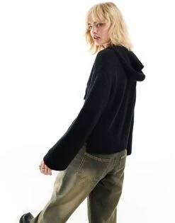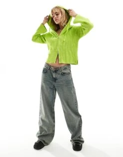 Monki Knitted Rib Hoodie Zip Up Cardigan In Lime Green For Women