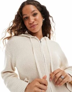 Monki Knitted Rib Hoodie Zip Up Cardigan In Light Beige For Women